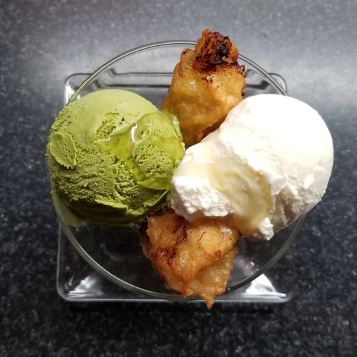 Honey covered deep-fried banana topped with two scoops of ice cream of your choice.