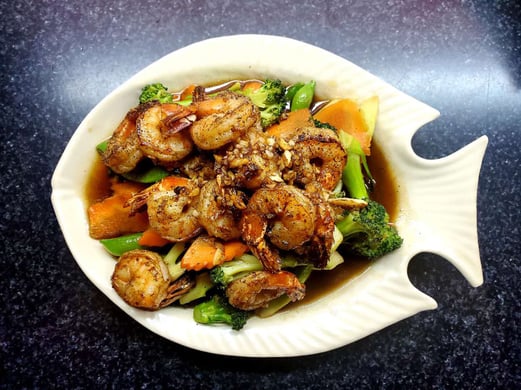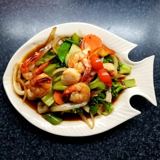 Prawns sautéed with garlic sauce on a bed of broccoli, snap peas and carrots.