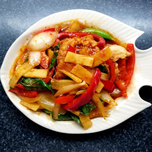 Red snapper in a crispy batter, coated in lightly caramelized garlic, sautéed with bamboo shoots, peppers, snap peas, fresh Thai basil and kaffir lime leaves. Spiced with Thai red curry sauce.