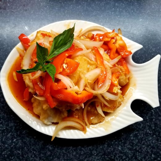 Red snapper in a crispy batter smothered in lightly caramelized garlic, sautéed with onions and peppers. Flavoured with our signature sweet and sour chilli sauce. Garnished with fresh Thai basil leaves.