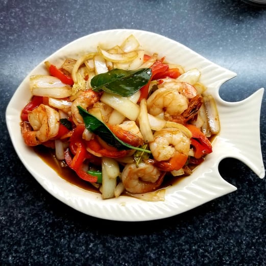Prawns sautéed with peppers, onions and fresh Thai basil leaves.
