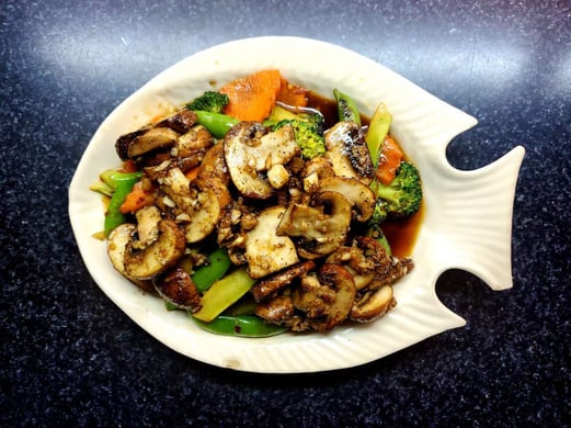 Fresh mushrooms sautéed with garlic sauce on a bed of broccoli, snap peas and carrots.