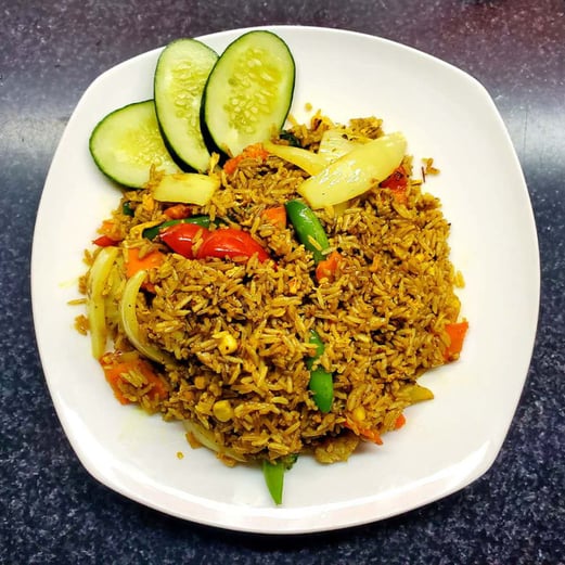Spicy yellow curry fried rice with egg, corn, peppers, broccoli, napa cabbage, carrots and snap peas.