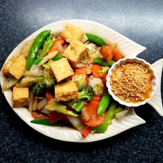 Fresh vegetables and deep-fried tofu sautéed in oyster sauce and garlic. Served with a side of our house peanut sauce.