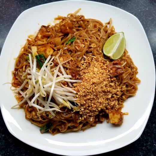 Rice noodles stir-fried with tofu, egg, green onions, bean sprouts and ground peanuts. Spiced with our house-made tamarind sauce.