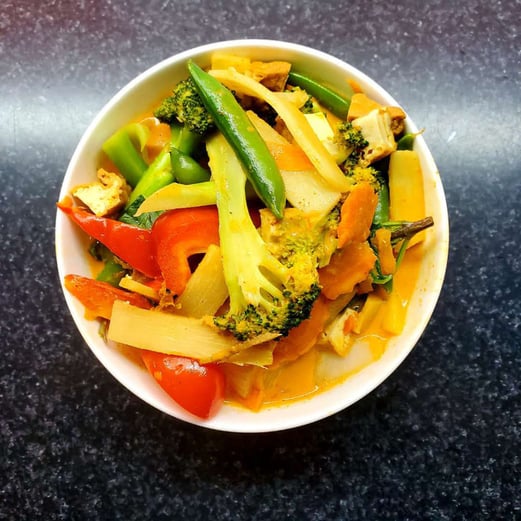 Coconut milk in a Thai red curry sauce with tofu, peppers, bamboo shoots and fresh vegetables. Flavoured with fresh Thai basil.