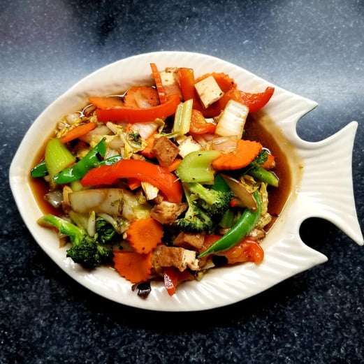 Ginger tofu sautéed with onions, black mushrooms, carrots, peppers, broccoli, celery, napa cabbage and snap peas.