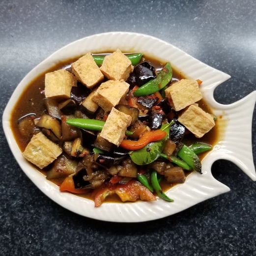 Eggplant sautéed in our house soy sauce with deep-fried tofu, peppers and snap peas. Flavoured with fresh Thai basil and kaffir lime leaves.